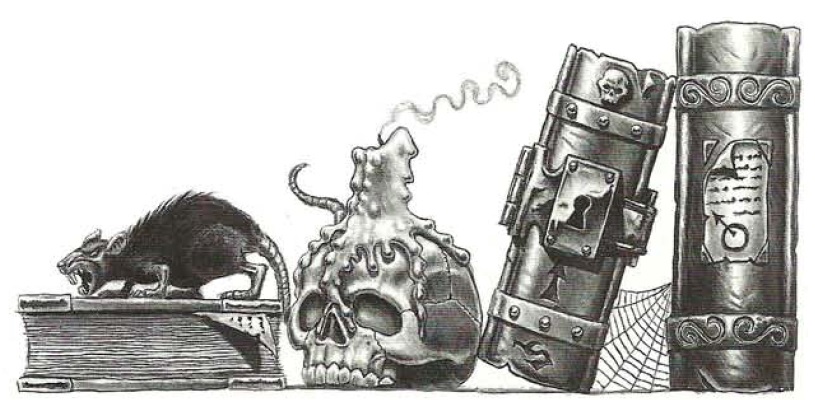 Pero algunos tomos mágicos contienen información sobre asuntos más siniestros. Ofrecen conocimientos indescriptibles sobre lo prohibido, explorando temas como la nigromancia o (peor aún) la demonología. Los cazadores de brujas y los siervos de Sigmar, Verena y Morr buscan estos tomos prohibidos por todas partes, en un esfuerzo por destruirlos o, en caso de no poder hacerlo, guardarlos en un lugar seguro.