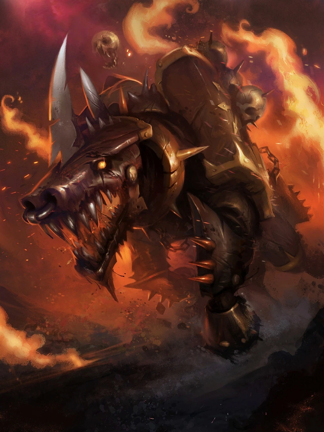 Джаггернауты, Сокрушающие дух, Копыта Кхорна, Джаггеры — громадные бронированные твари, частью демоны, а частью - переплетение зачарованной стали и мускулов. Это могучие звери из скрипучего железа и меди, выше человеческого роста и огромного веса. Шкура джаггернаута - латы из сваренных металлических чешуек, украшенные метками Кхорна и покрытые засохшей кровью его жертв. Внутри тела демона вместо крови бушует огонь, раздуваемый жаром демонического сердца. Его железные копыта высекают искры при каждом шаге, а бронзовая пасть выдыхает удушливый тёмный дым. Это чудовище, в котором первобытная ярость заключена в сокрушающее тело из металлических костей и мышц.
