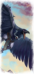Crow-men attack their enemies by flying and drawing them bellowing and helpless into the air, and then gutting them with their glittering talons.[1a][2] They can catch the Elemental Winds and sail across them with something almost akin to grace.[3]