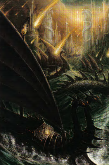 Malekith's last plan had failed and his energy was spent. His kingdom lay beneath the waves and his army was all but destroyed. Upon the floating castles of Nagarythe -- the terrible "Black Arks" as they would be called in later years -- the Witch King and his minions fled the wrath of the cataclysm they had unwittingly unleashed. North and west they travelled, across the churning seas to the desolate wilderness of the continent of Naggaroth -- the Land of Chill.[1k]