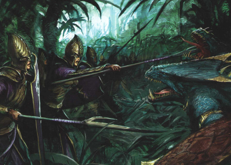 War Hydras thunder into the fray, trampling those who stand their ground, belching forth dark flame to consume those who flee. Cold One Knights strike home in a blur of steel and claw, the cold skill of the riders matched only by the savagery of their steeds. Sorceresses unleash their dark and forbidden magic, stripping flesh from bone and soul from body. [1b]