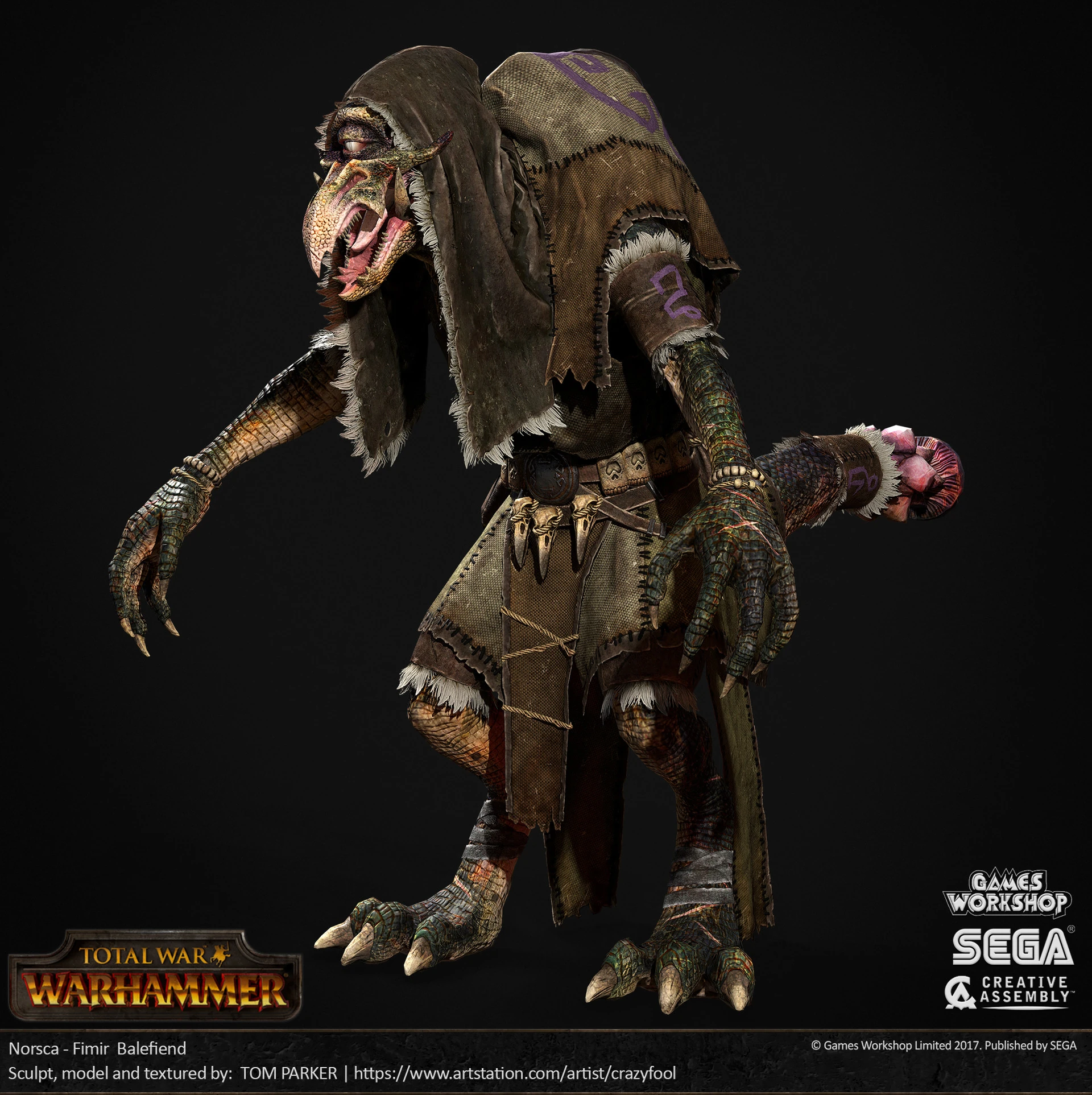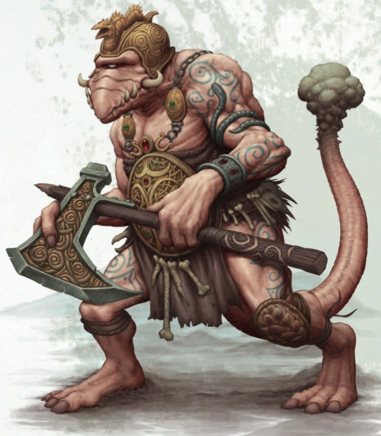 A Fimir Warrior of the Fimm caste, as rendered for Total War: Warhammer. Note the bony protrusion on the tail which denote a member of the Fimir warrior caste.