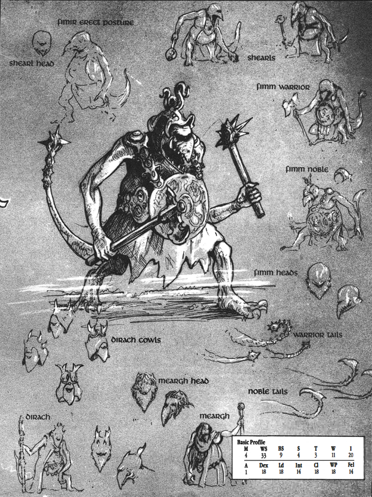 Only the warrior caste Fimm and the elite Fianna Fimm, retainers of the Fimm Nobles, are likely to turn up as allies of other mortal races. Such contingents will certainly contain Dirach sorcerers or possibly even a Meargh, but the wretched Shearls, as the Fimir slave caste is known, perish with the sundering of the clan.[10a]