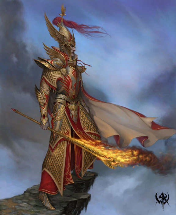 After the Dragon Gate of the Outer Kingdoms fell to the combined armies of Malekith and Malus Darkblade, Eltharion was dispatched to Avelorn with the High Elves' most loyal Swordmasters to help defend the Everqueen, Alarielle. When a flight of Black Dragons was sighted, Eltharion allowed his hatred and bitterness to overwhelm him, and he sought battle against the Witch King rather than retreating to safety with his precious charge.[9a]