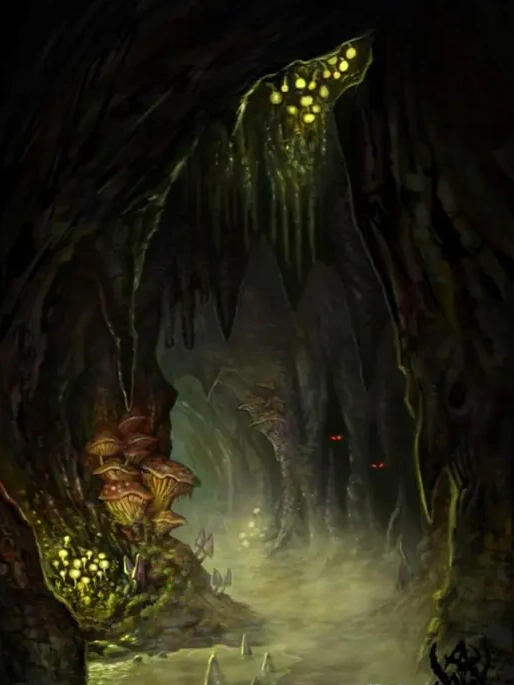 "A hand broke the surface, flapping madly in the air. The second followed, then a bald, pointy head. Were there strong light in the cavern, the newly spawned goblin would have appeared a whitish green. But there was not. Only the weak blue shine of glowshrooms held back the dark, and all was dingy. The Runt pulled himself up out of the hole. A huge mushroom stood above his birthing-hole, wilting and black now it had served its purpose. The goblin lay on his back, panting. Scrabbling noises came from the cave all around him; other runts, pulling themselves out of the earth."