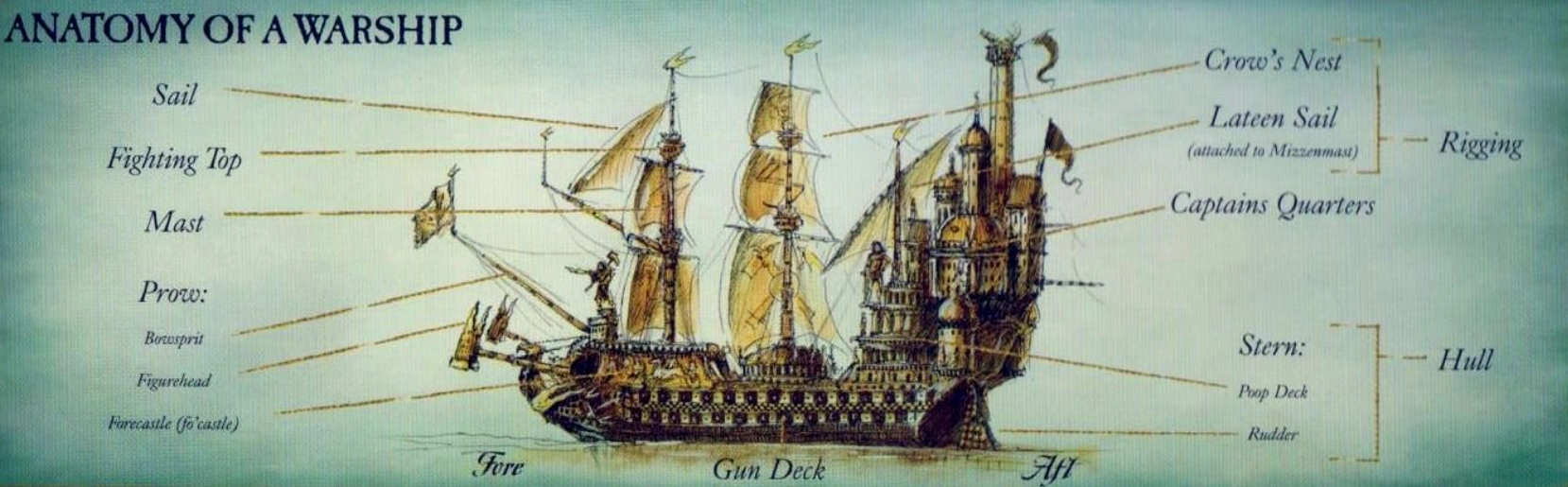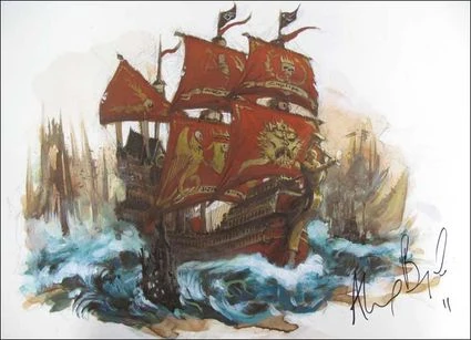 As the flagship of the Grand Alliance of the Sartosan pirate lords that sought to hunt down the Dreadfleet, the Heldenhammer stands out from the rest of the Sartosan fleet. It resembles a three-masted galleon, but on an unprecedented scale -- the warship features hundreds of great cannons, entire batteries of siege mortars and murder holes for snipers. The warship is unmistakably of the Empire, fish-tailed mer-gryphons on the sails adding a naval touch.[1a]