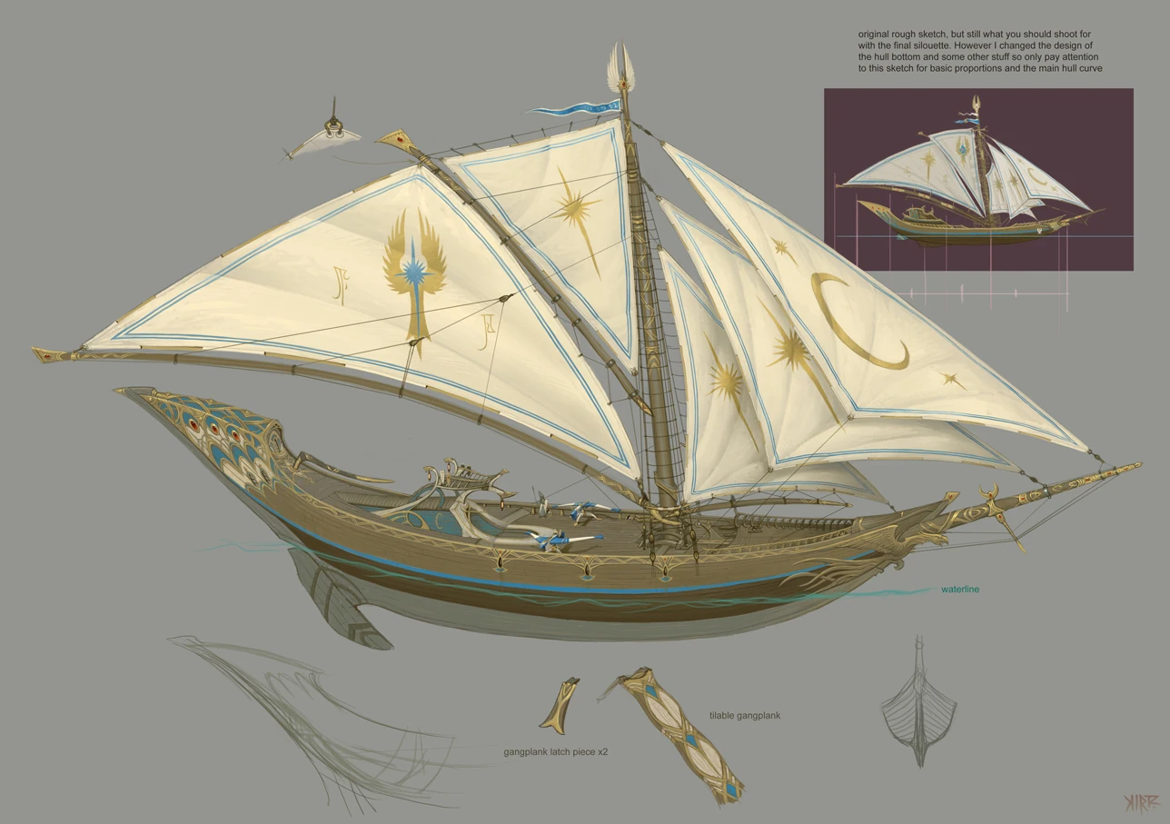 Concept art of a High Elf ship created for Total War: Warhammer II.