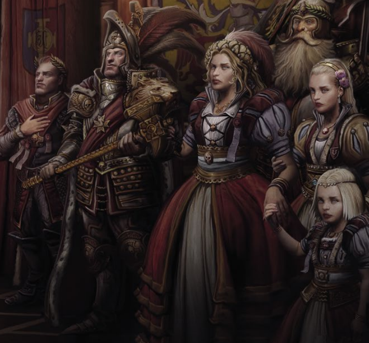 Patriarch and head of House Holswig-Schliestein, Karl Franz, who was elected to the Imperial throne in 2502 IC, followed in his father Luitpold I's footsteps, and was hailed as a patron of the arts and sciences, as a military innovator and as a valiant general.[2a]