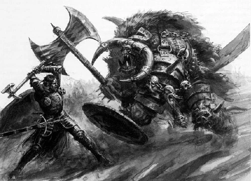 At that sound, the instincts of the warlord were overcome by memories inscribed in the soul of his race; memories of mighty barbarians defeating the Orcs in a war for the dominion of the rich plains, and driving them to the desolation beyond the mountains. In those times, these Men were led by this very same champion, he who had denied the possession of this land to the Greenskins. In that moment and for the first time in his life, the Warlord felt the coldness of fear upon him. The Warlord stood dumbstruck, a split second of hesitation that would cost him everything.