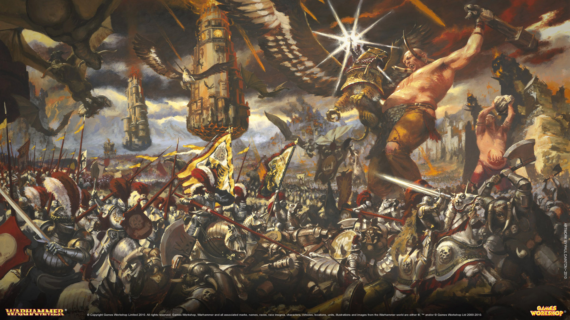 Karl Franz’ lead the forces of the Reikland together with Valten, arriving at Talabheim, planning to fall Archaon’s army in the back while they sieged Middenheim. They arrived when Archaon, unable to take the city, was forced to retreat and recuperate his forces. Marshaling his forces at Grimminhagen, Karl Franz’ later heard that Valten and his troops had been attacked and rode forth to aid Sigmar’s Chosen. The Everchosen had retreated to the village Sokh, where the final battle of the Storm of Chaos would take place. Here, the armies of the Empire met those of Chaos.