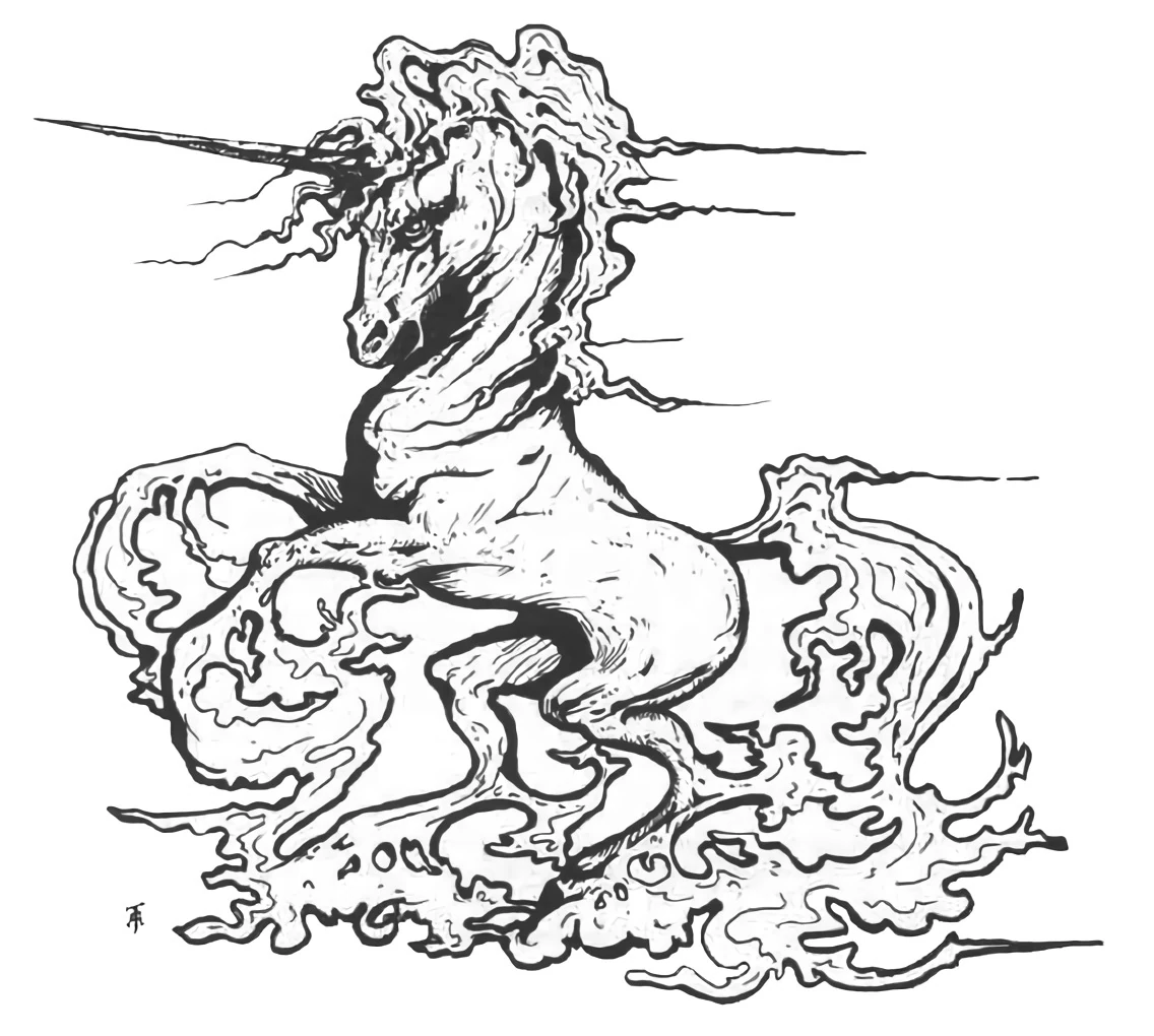 Ki-rin have horse-like bodies, with long, flowing manes spun with sparks of silver lightning. In the centre of the creature's forehead sprouts a long silver horn, used to impale its foes. They are occasionally ridden by powerful Far Eastern heroes, particularly the samurai lords of Nippon.[1a]