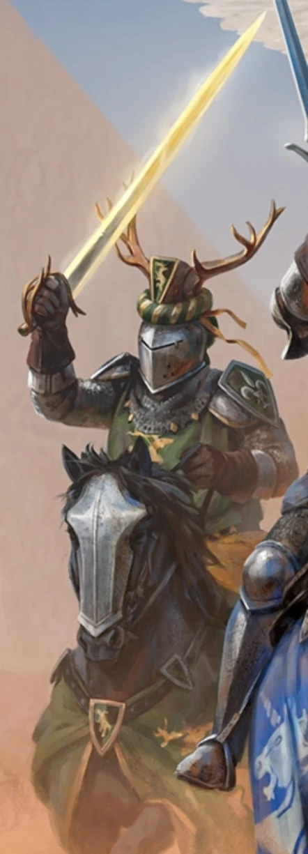 True to his name, Leodegar bore the heraldic symbol of a rearing golden hart upon a field of green and black, and the image of the horned stag woven upon his chest often gleamed like fresh sunlight.[1]