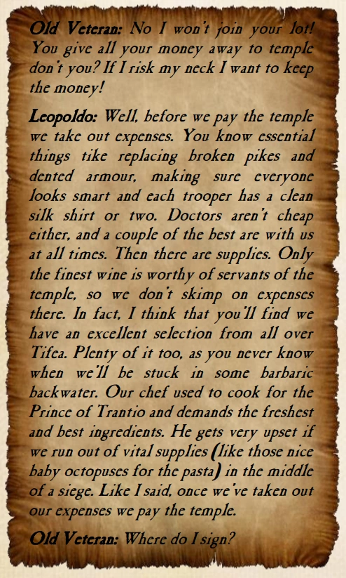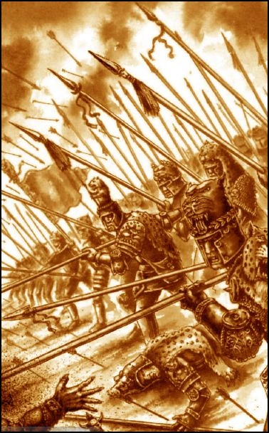 And so the regiment marched out of Tilea and took service with various other princes such as Ettore Rinaldo[2a], the prince of Trantio. After much hard campaigning the regiments had been mauled in many unlucky battles. The superstitious soldiers regarded this as the vengeance of the Leopard which they had sworn to protect and whose temple they had pillaged. Leopoldo, anxious to hold his regiment together, called a meeting on the stricken battlefield of Terramorta and told his troops that they must regain the favor of the gods.[1a]