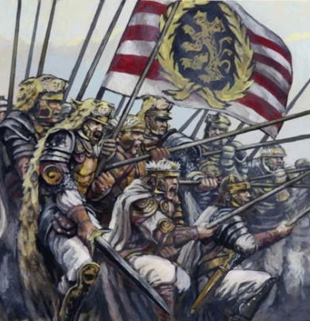 The Leopard Company's troops are known to wear burnished brass plate armour with a very ornate muscle cuirass with a leopard's face embossed on the breastplate. Leather tassets are attached to the cuirass. They were white uniforms and white crests and gilded or real wreaths of laurel leaves around their helmets.[1a]