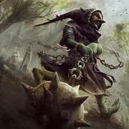 When used against the enemy, the Night Goblin Fanatic is held down by his mates until an enemy unit approach close enough for them to launch their attack. At this time, the mob hands the fanatic the end of a massive chain and chucks him in the direction of the enemy. Free at last, the deranged Night Goblin would spin crazily. After the initial shove, the Fanatic has no directional control and will recklessly plough through anything, including both enemy troops or even his own regiment. Eventually, however, a Fanatic will stumble, throttle himself with his chain or simply collapse, dying in a maniacal and convulsive fit. Extremely few have ever survived their experience as a fanatic, and through it all, those Fanatics that have met their end bears a look of self-satisfaction upon their tongue-lolling face.[1a]