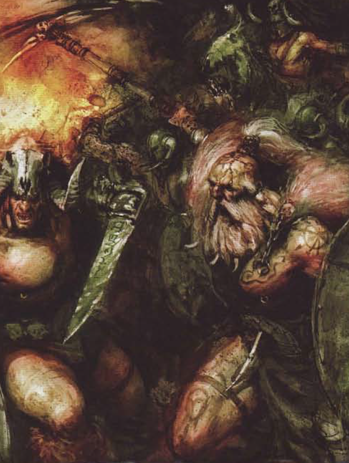 Fleeing across the northeastern rivers, the Norsii were then forced to contend with the fierce Ungol horse-tribes, but were able to fight through them to reach the Troll Country. There, the Norscan sagas record the final stand of the mighty Ekkil Bloodheart, a giant warrior of great renown and incredible power who held off the advance of the Ungol hordes long enough to allow his kinsmen to flee to the Chaos Wastes. Oral tradition records Ekkil, proud to the point of insanity, as having severed his own head from his neck to deny the Ungols the pleasure of killing him.[21a]