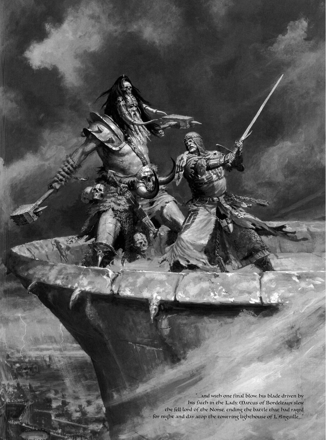 It was a droning noise that shuddered the courage of all who heard it -- a terrible sound that spoke of the need and desire to make war for no reason other than the suffering it would cause. Here, clearly demonstrated, was the reason Sigmar was forced to drive the Norsii from his Empire: for where the Men of the Reik and the other southern tribes sought peace and plenty, the Northmen craved only battle and war. Where development and progress were the watchwords of the Empire, the joy of killing and the lust for domination drove the grim warriors of the savage north. Where the gods of the south rewarded worship with peace and protection, the baleful Dark Gods of the Northmen demanded worship and offered naught but war and the power to carry it on in return.[9]