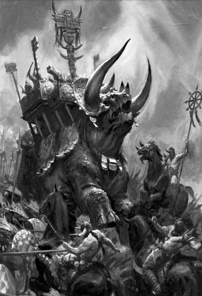 - Chaos War Mammoths - The Chaos War Mammoth is like unto a living mountain, a wooly colossus bedecked with an elephantine trunk and great curved tusks. Of all the terrible beasts that roam the wastes of the uttermost north, few are as dangerous as these great primeval creatures tainted by Chaos and known to the scholars of the Old World as Mammoths. Roaming across the frozen north are the woolly colossuses of the Old World -- the gargantuan, feral Mammoths. With their elephantine trunks and great curved tusks, they are not unlike living mountains, feeding off the thorny barrens and causing the ground to quake as they follow their endless migration paths. The Northmen frequently seek them out as abandoned calves, for if a mammoth is trained early enough, it can be brought into battle as a highly effective trampling weapon that can easily reduce enemies to bloody ground-smears. Exposure to Chaos-tainted materials has resulted in some of the species mutating into larger and more aggressive versions of the regular feral variety, sometimes sprouting extra horns that make them desirable to be ridden into battle as War Mammoths.
