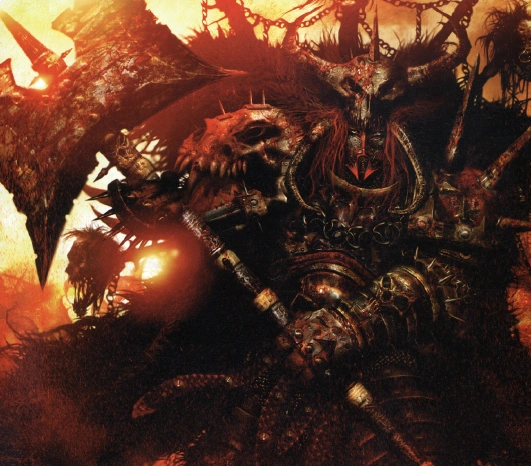 On the thirteenth, most terrible day of the siege, Cormac Bloodaxe, who had slain so many in battle that his Daemon-axe now perpetually ran thick with congealed blood, awoke knowing the will of his god was to be carried out. For his vision seethed red as though his eyes were drenched perpetually in blood. Before a great pit where the Norsii had thrown the corpses of their enemies in honour of Khorne, there did Cormac command the greatest warriors of eight clans to sacrifice themselves to Khorne's glory. Mightily pleased with their valour and tithe of souls, the Blood God did take up the Norsii high king and use his body as the physical host to call unto the mortal place a manifestation of pure, unbridled rage -- a Bloodthirster, a Greater Daemon of Khorne.[9]