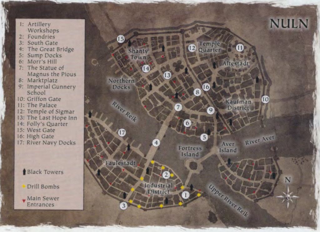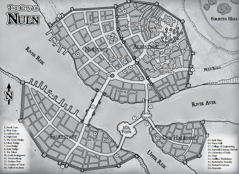 Gazetteer of the city-state of Nuln in 2522 IC in the alternate timeline of the Storm of Chaos.[15a]