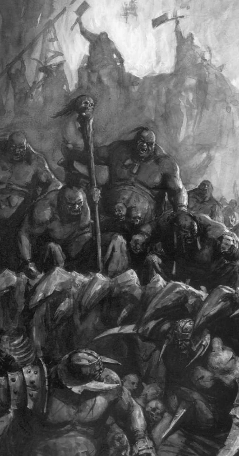 Ogres are a grasping, greedy lot and once they fix upon a target they are brutally single-minded. The assault on the Dwarf stronghold of Karak Azorn is a bloody testament to Ogre destructiveness and the driving power of their gluttony. For ages, Dwarf expeditions have struck eastwards into the Mountains of Mourn, seeking the fabled Mountain of Gold. While they have yet to locate it, they have found many sites rich with gems and precious metals. The few mines and fortresses they have established in that hostile region have entrances cleverly hidden amongst the peaks and rock faces, for the Dwarfs rightly fear discovery by the Ogres. The second largest Dwarfen outpost in those lands was discovered by a far-ranging Ogre Hunter who took word of the settlement back to Thogub Smashclub, the Tyrant of the Angry Fist tribe. Thogub, an immense slab of an Ogre, rubbed his meaty hands together at the news, fair chortling with joy. He had learned first hand of the riches stored within such strongholds and he remembered well his own fondness for roast Dwarf meat from his adventuring days in the Worlds Edge Mountains. Gathering his large tribe about him, the Ogres of the Angry Fist marched for war, aiming to break the gates and plunder the riches within.[1q]