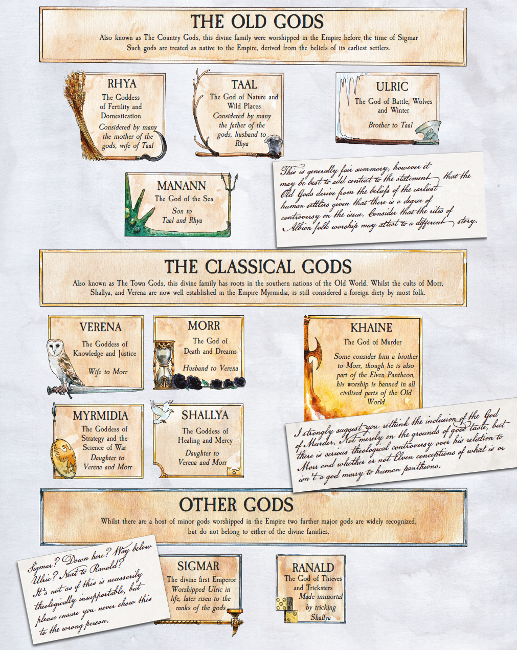 In addition, some Old Worlders venerate non-Human deities, borrowing gods from the Dwarfs, Elves, and even the Halflings, including them in their prayers and ceremonies. The following entries include a sample of many of the minor gods worshipped in the Old World.[1b]