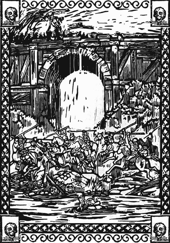 Then Sigmar awoke with a start within a bleak world of ashen grey. The young Unberogen prince wandered this grey land for how long Sigmar could not say until a pack of shadowy humanoids came upon him. With a golden sword in his hand, Sigmar fought valorously against these unnatural foes, yet as the last of the fell creatures led out a howling screech which forced Sigmar to his knee's, where he stood helplessly before the creatures own black blade, a double-bladed axe blocked the creatures swing. With one stroke, Bjorn Unberogen killed the creature and embraced his son in his large arms. Reunited, Bjorn told Sigmar that they needed to go towards a large black gate that loomed in the distance, where there they were met by a host of shadowy monsters that were once men.[1k]