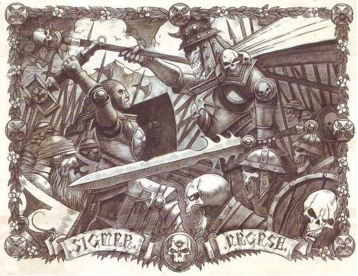 In Sigmar's divine, all-seeing wisdom, he sees the need for strength from his followers- not only of sinew, but of will and of faith. Unholy threats assail his nation, both from within and from without, and thus he channels his might into his mortal champions- the mighty Sigmarite Warrior-Priests. Above all, however, it is faith that serves as the chief weapon of the Empire. Unwavering in their devotion, the warriors of the Empire stand strong against such horrors that would make lesser men go mad with fear. They need only hear the recitation of the verses of the Holy Deus Sigmar to drive them in committing unparalleled acts of heroism. Yet now the darkness is gathering, for far to the north, a dark lord has risen amongst the Northmen, driving the fur-clad savages of the north to take to their longships with fire and steel. The final battle draws near, and now, more than ever, the Empire will need its faith, and the blessings of Sigmar, lest Chaos consume the greatest nation of Men on earth and the foul Daemon-Gods attain their final victory. Throughout the lands of the Empire, the Heirs of Sigmar gird themselves for war and recount the glorious deeds of their forebear, and they shall meet their foes as they always have- with faith, fire, courage and steel.[8a]