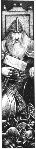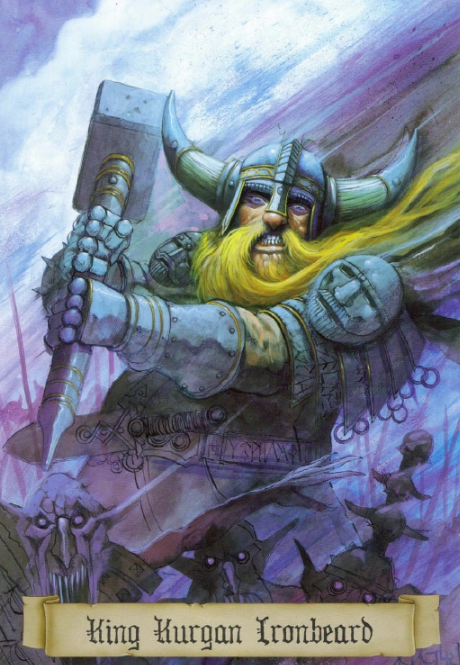 By chance, the Orcish warband had made prisoners of the then High-King of the Dwarfs, Kurgan Ironbeard, as well as his kinsmen, as they were on route to meet with the Stoneheart Dwarf clan of the south. The Unberogens cornered the Orcs, unwittingly coming to the rescue of the Dwarfs as well. This meeting would be a turning point in Man's history. In the battle that transpired, Kurgan Ironbeard bore witness to this young, human prince facing down the Black Orc. Despite young Sigmar's mighty strength, every killing blow his bronze sword had made was turned aside by the armour of the Orc, and every blow from its flaming axe came all too close to ending his young life. Ironbeard broke free of his bonds and fought his way to Vagraz's tent, where he kept his pick of the Dwarf King's possessions. Including the mighty hammer Ghal-Maraz, the Splitter of Skulls.[1m]
