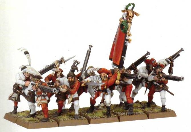 What the handgunners known as the Silver Bullets lack in discipline they make up for in accuracy. These sharpshooters maintain that they fire silver-plated shot with every volley, but in truth, each of their number is given only a single silver bullet from their foul-mouthed Marksman-at-arms, Curser Bredt, upon their induction into the ranks. Just as much a talisman as a weapon, each Handgunner would only use his silver bullet if no other option were present. The men of Bredt's unit believe that, whilst their good luck charms are safe, they too are protected from whatever Sylvania's darkness can throw at them.[1a]