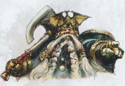 Even as High King Alriksson quieted the crowd to begin the pronouncement, a latecomer marched into the vast hall. It was none other than the High King's sister's son, Thorgrim, who had earlier been presumed slain. He was well known in Karaz-a-Karak and had long been mentored by the aged High King. Now he returned, flanked by a sight not seen in Karaz-a-Karak for thousands of years — a contingent of Dwarfs from Norsca. For during the campaign in Kislev, after High King Alriksson had been injured, it had been Thorgrim who had re-established the old ties with those long distant clans. In turn, each of the Norscan kings spoke of Thorgrim, and of the deeds of valour he had performed in the icy north; of great monsters slain and battles won.[1b]