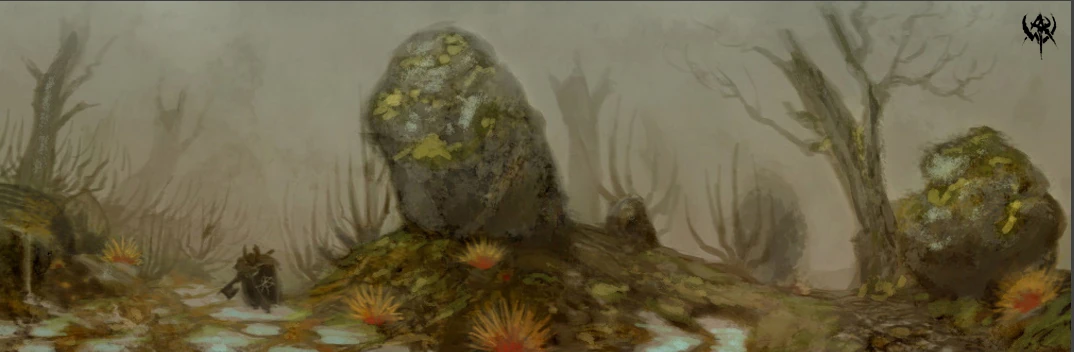 The bleak landscape of the Troll Country as depicted in concept art created for Warhammer Online: Age of Reckoning.