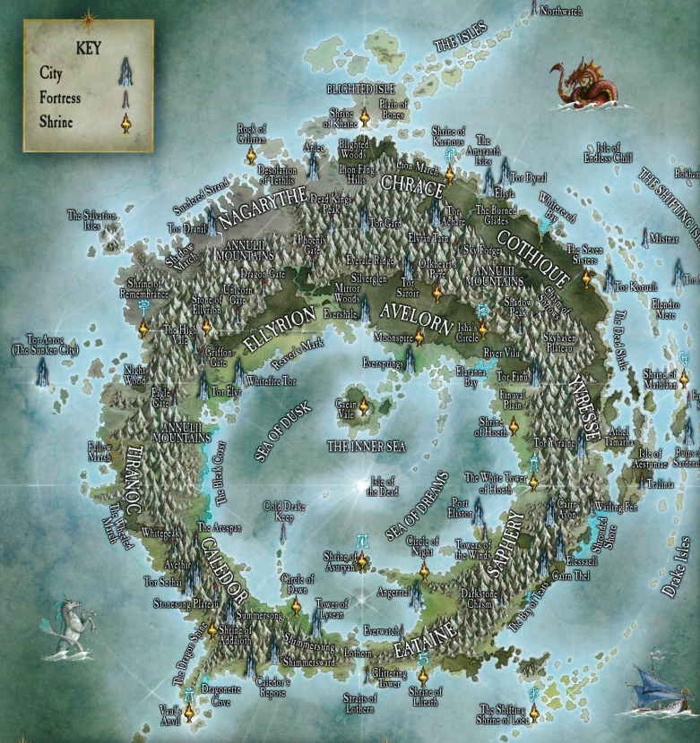 A map of Ulthuan with the heraldry of the Ten Kingdoms of the Asur.